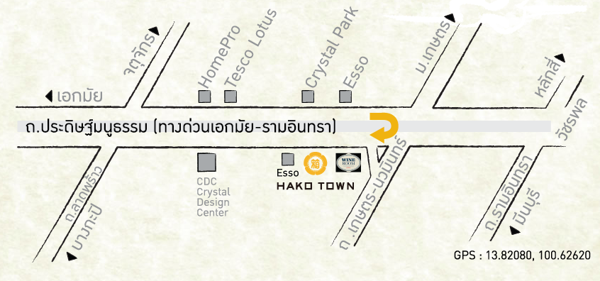 การเดินทางมา เมืองอาหารญี่ปุ่น Hako Town มาไม่ยากเลย อยู่บนเส้นเลียบทางด่วน เอกมัย-รามอินทรา หากวิ่งมาจากทางเอกมัย ให้วิ่งมาสุดทางที่แยกเกษตร-นวมินทร์ แล้ว U-Turn กลับมาอีกไม่เกิน 500 เมตรชิดซ้ายไว้จะเจอ Hako Town ที่ตั้งอยู่ติดชิดริมถนน อยู่ก่อนถึงปั้ม Esso หาไม่ยากครับ