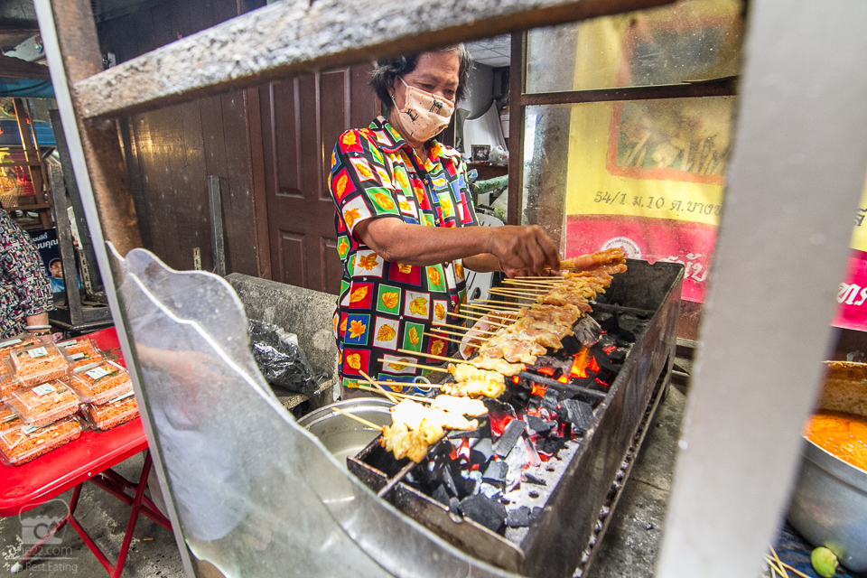 เดินลงมาจากบันไดปุ๊บจมูกได้กลิ่นหมูย่างหอมๆลอยมา มองหาต้นทางเจอ แล้วร้านหมูสะเต๊ะ หน้าตาหน้ากิน ว่าแล้วก็ขอหยิบที่เราหม่ำกันมาให้ดูต่อเลยดีกว่า