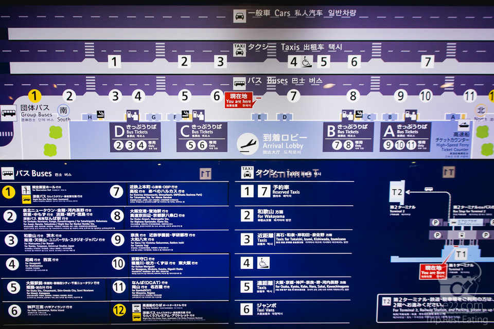 โดยเมืองคุณผ่านตม.ออกมา ที่ Terminal 1 แล้วอาจจะต้องออกแรงวิ่งกันสักนิดนึงไปที่ Gate ในบริเวณ ชั้น 1 จะมีรถบัสออกตอน 00.45 น. และรอบสุดท้าย ตอน 01.45น. พาเราไปยังสถานที่หลักๆในเมืองลงที่สถานีรถไฟ Osaka Station (Umeda) ราคาตั๋วเที่ยวเดียวอยู่ที่ 1550 เยน แม้ Couter จะปิด ตอน 5ทุ่มแต่เราก็ยังใช้ตู้อัตโนมัติตรงบริเวณ Gate ซื้อตั๋วได้อยู่ครับ