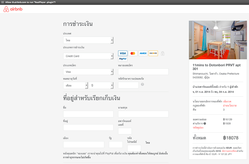 5.จะ พามาจ่ายผ่านบัตรเครดิต ตรงนี้ละที่เราหากได้รับส่วนลดมาจากการจองผ่าน link ของเพื่อน จะเอามาใช้ได้ด้วยนะครับ และก็ดูตรงการจ่ายเงินได้เลยจะมีบวกค่าบริการและภาษีอีกนิดหน่อย จากนั้นกดจ่ายเงิน
