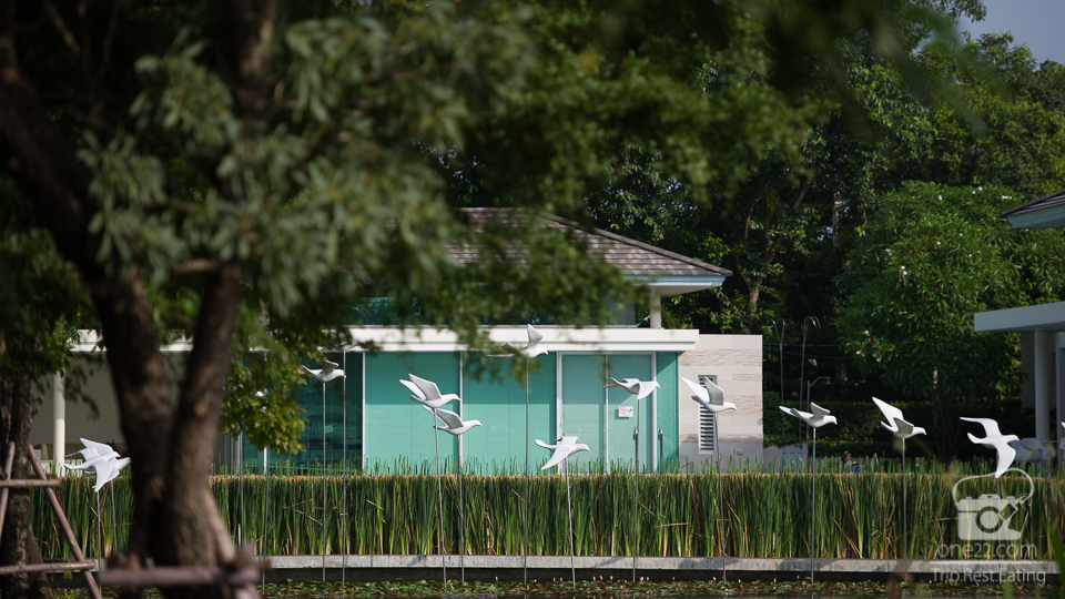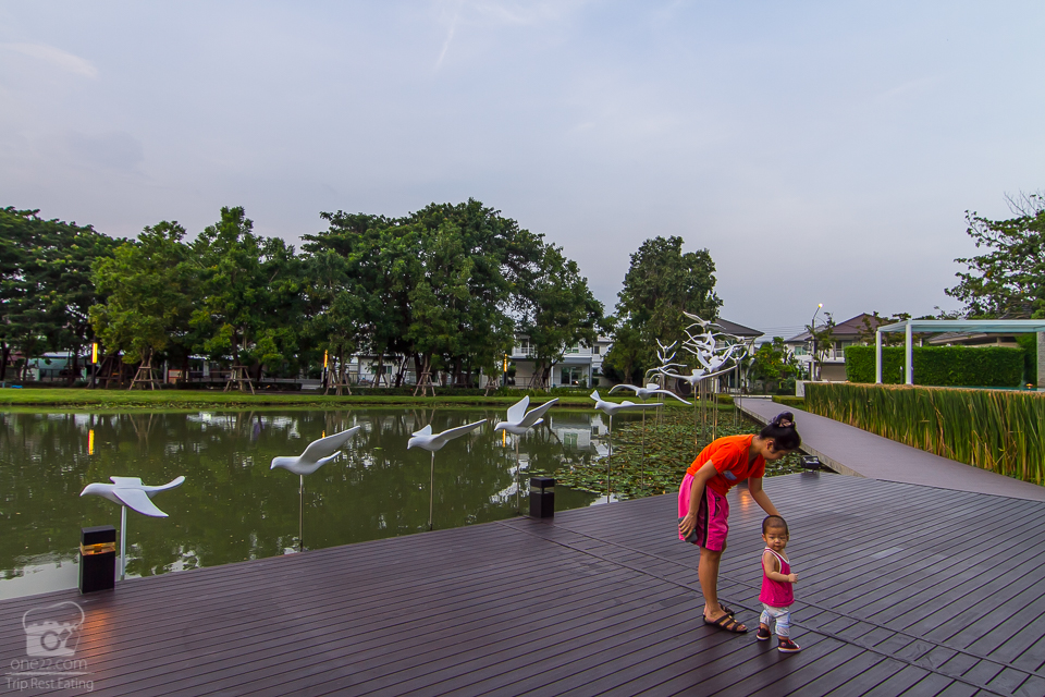 เราจอดรถและเดินเข้ามาในส่วนของ สำนักงานขาย จะมีฝูงนกฝูงนี้คอยต้อนรับอยู่ ถือเป็นสัญลักษณ์สำคัญของโครงการนี้ เลย สวยดีครับแถมในทะเลสาบมีบัวขึ้นอยู่ด้วย บรรยากาศดีมาก