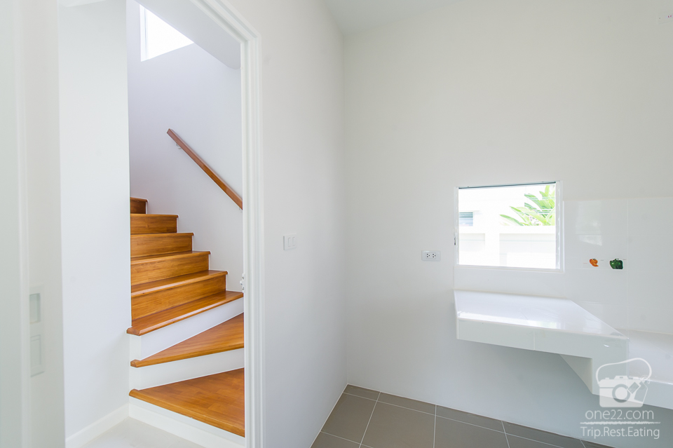 ห้องครัว จะอยู่ชิดติดกับทางขึ้นชั้นสองเช่นกัน มีการต่อท่อน้ำดี ท่อน้ำทิ้งไว้เรียบร้อยครับ