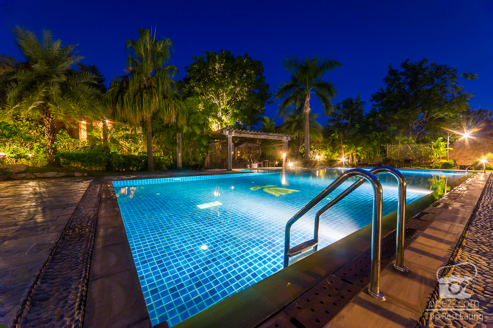 เดินลงมาอีกนิดจะเจอสระว่ายน้ำขนาดกำลังดีครับ บรรยากาศช่วงใกล้ๆค่ำเปิดไฟทำให้สระน่าว่ายดีนะครับ