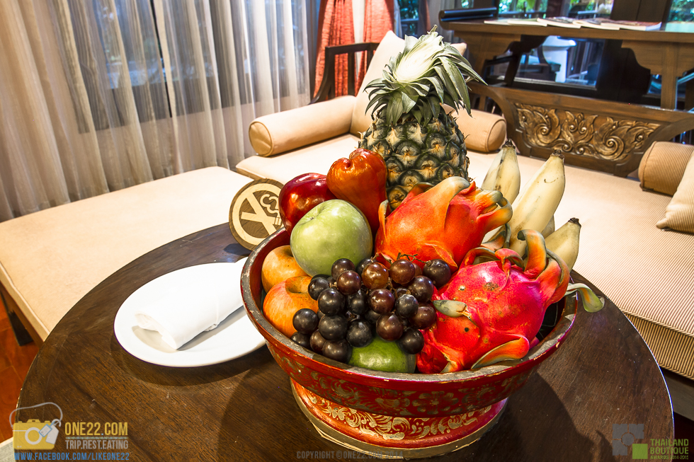 ในห้องตรงบริเวณโซนโต๊ะรับแขกจะตั้ง Welcome Fruit ใส่พานขนาดใหญ่มากกกก ผลไม้ดูคุ้มมากๆเลยนะครับจัดเต็มกันจริงๆ