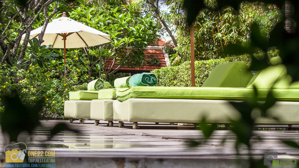 รอบสระว่ายน้ำก็มี Daybed ริมสระสีเขียวสบายตา ล้อมรอบ