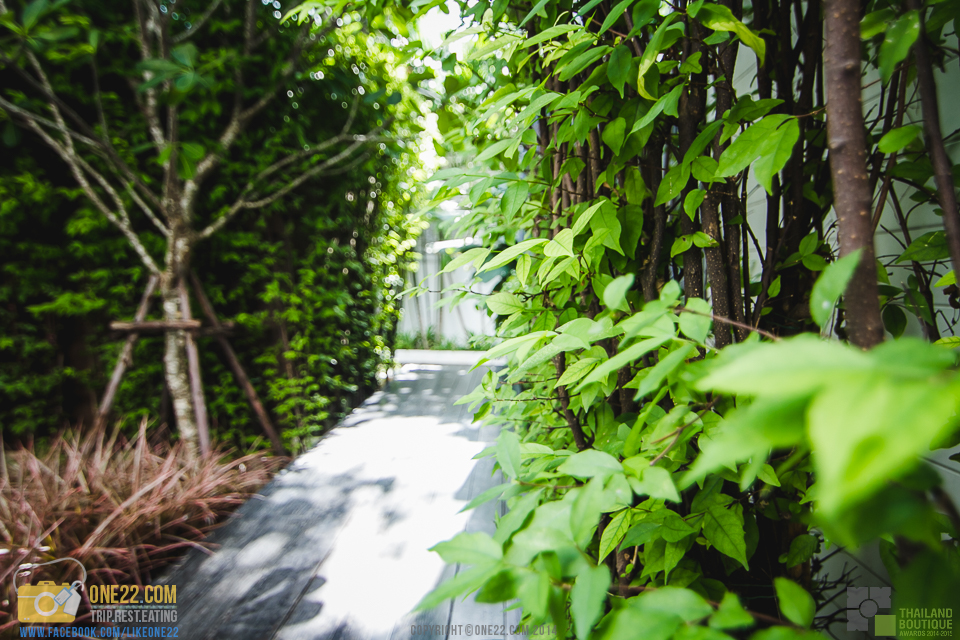 เดินทะลุออกไปยังโซนที่พัก จะเจอกับแนวต้นไม้สีเขียวๆชวนให้สดชื่นและเข้ากันดีทีเดียว