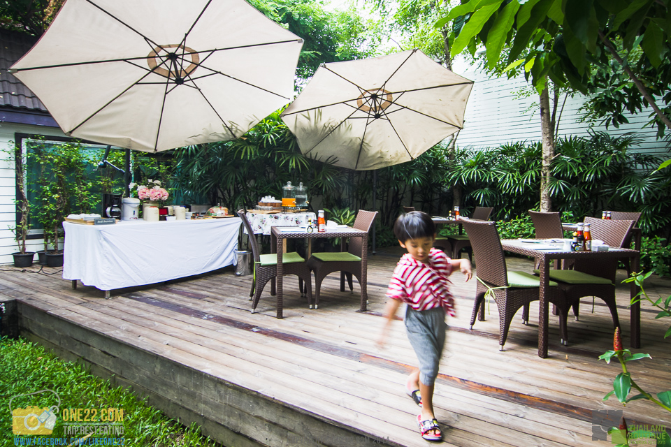 มาดูบรรยากาศรอบๆบ้าง ด้านหลังตกแต่งเป็นสวน และโซนห้องอาหาร เป็นห้องอาหารในบรรยากาศสีเขียวๆของต้นไม้รอบๆ