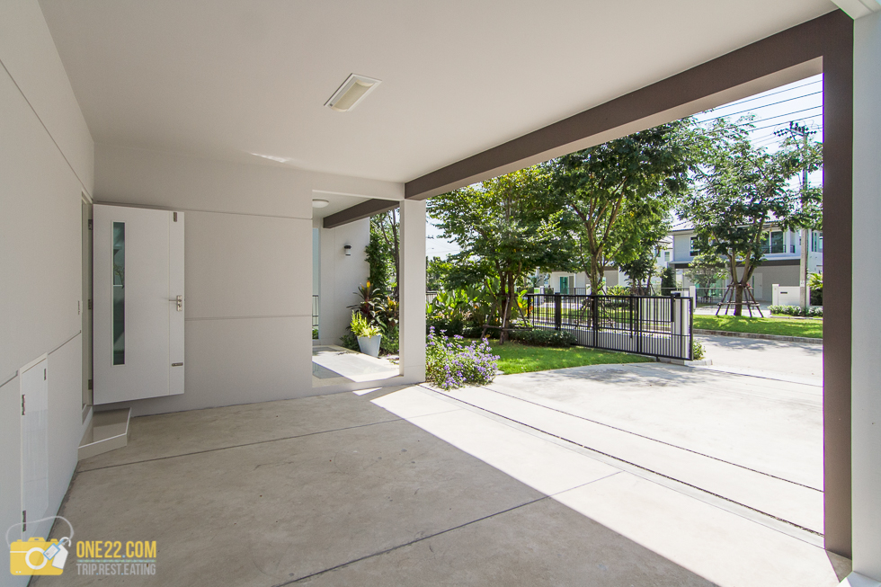 ด้านหน้าบ้านกว้าง และอย่างที่ข้อมูลแจ้งไว้ จอดรถได้ 2 คันสบายๆเลยครับ และมีประตู Connecting เปิดเข้าบ้านจากตรงที่จอดได้เลย