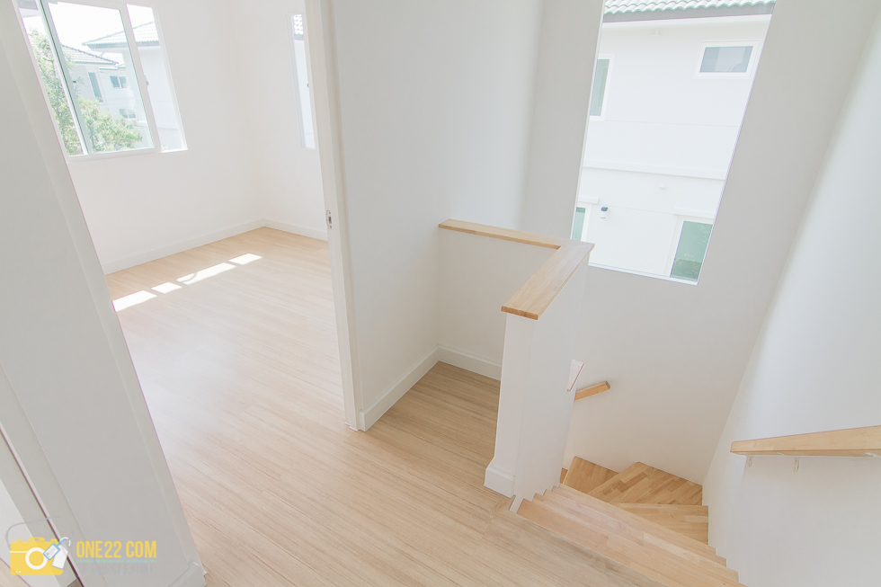 ชั้นสองจะมีทั้งหมด 3 ห้อง โดยมีห้องนอน master Bedroom ที่จะอยู่ด้านหน้าของบ้านหน้าต่างก็เยอะดีครับ ส่วนของพื้นชั้นสองจะปู พื้นเป็นรามิเนตสีเนื้อไม้