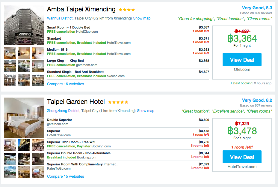 จากนั้นจะเห็นว่า ตัวเว็บจะดึงราคาจากทุกเว็บขึ้นมาให้เราเปรียบเทียบทั้งข้อมูล ประเภทของห้องพัก สิ่งที่ได้ และแน่นอนตัวราคา เราสามารถเลือกดูและกดเข้าไปจองกับเว็บที่เราพอใจได้เลยครับ