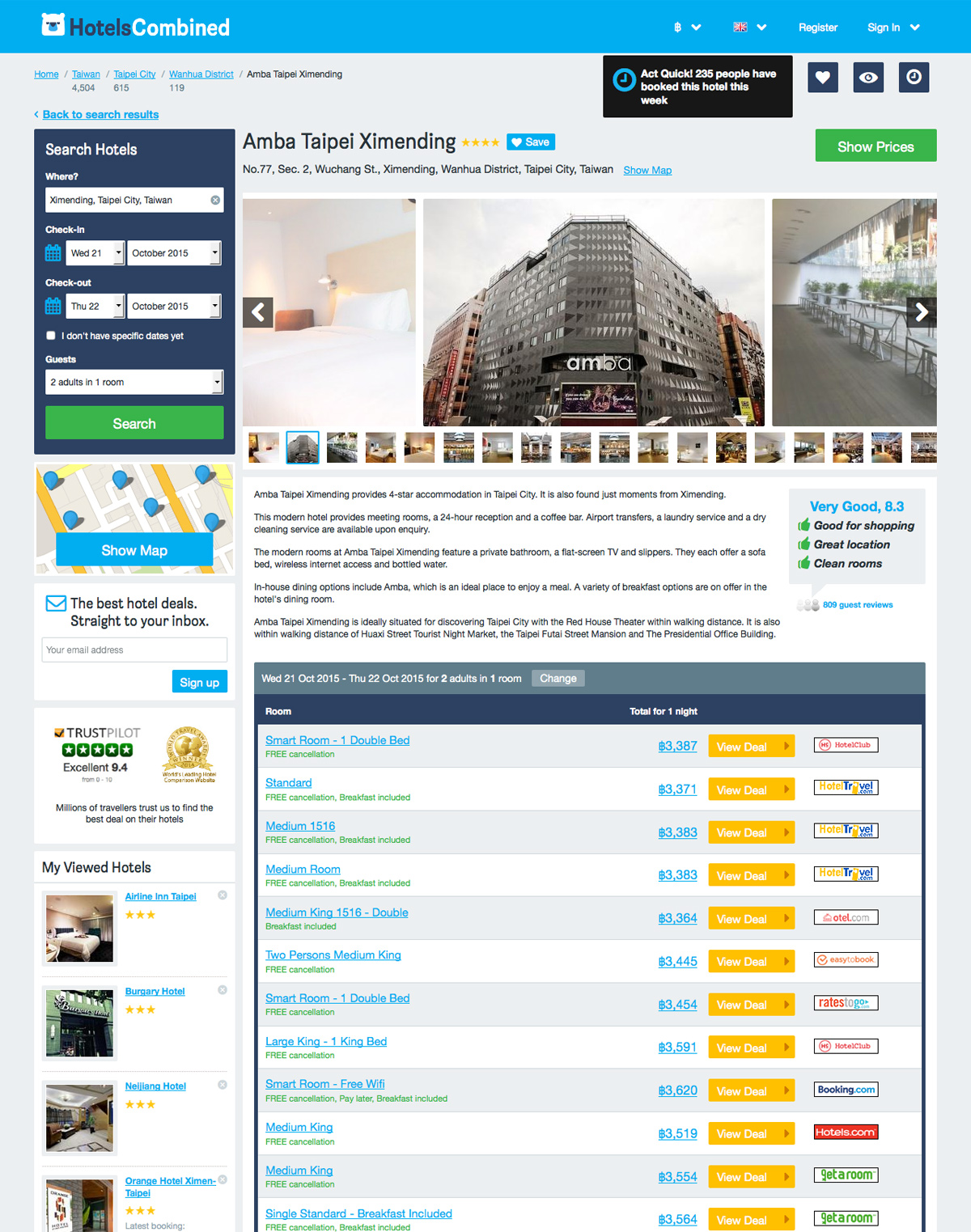 กรณีผมคือค้นหาที่พักย่าน Ximending ย่านช้อปปิ้ง ใจกลางไทเป ตัวเว็บค่อนข้างฉลาดพิมพ์ม่กี่ตัวก็ขึ้นมาให้เราเลือกเยอะเลย