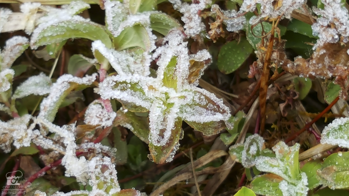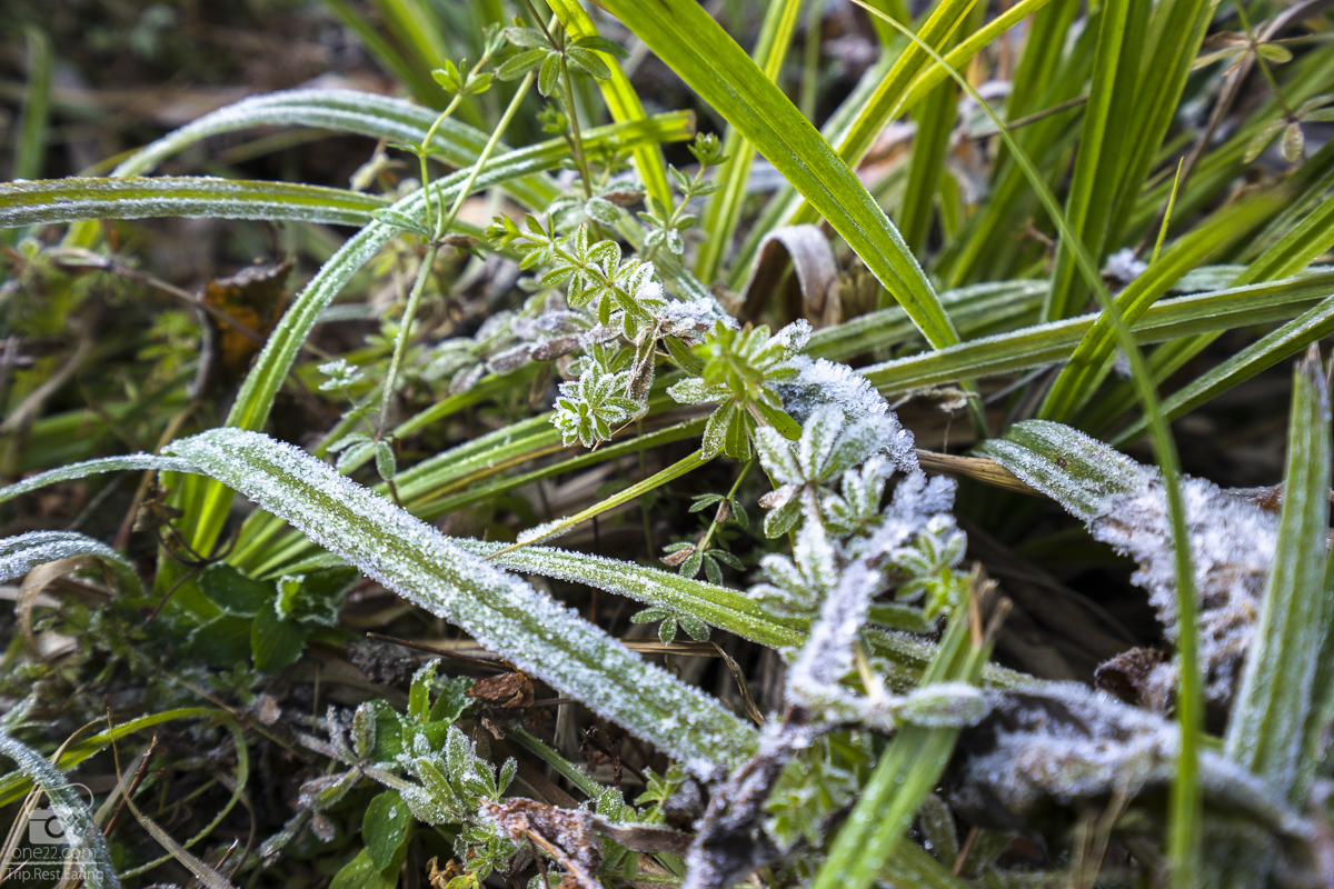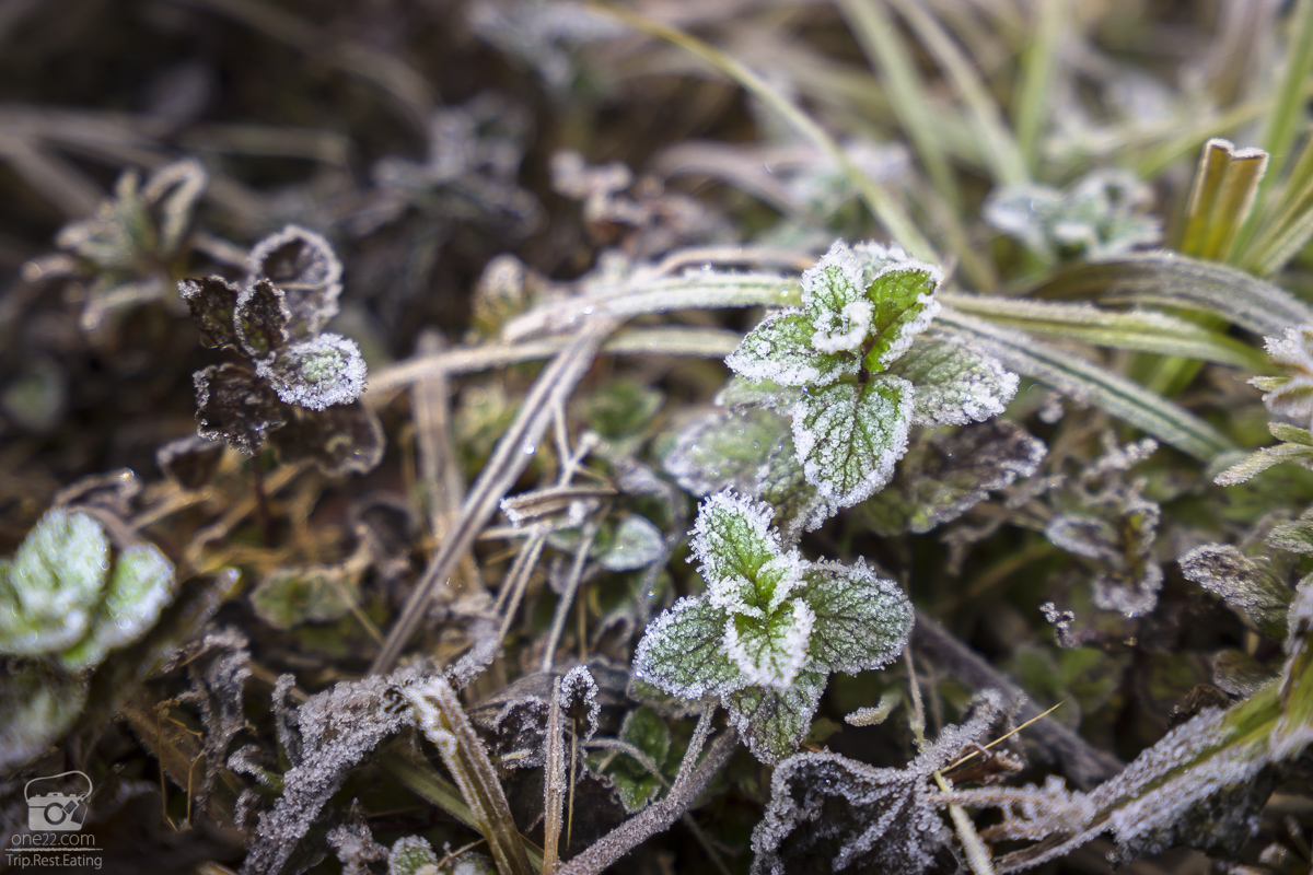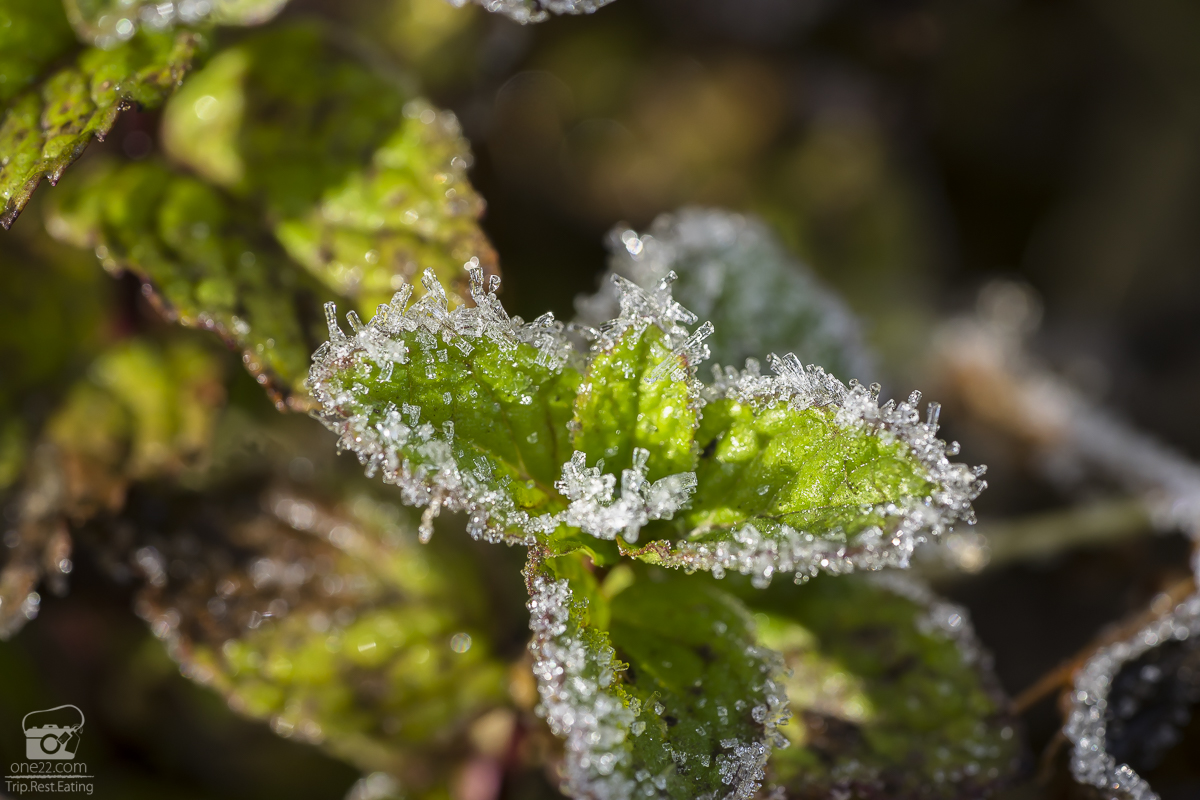 น้ำค้างแข็งที่จับบนยอดหญ้าดูใกล้ๆสวยงามราวเกล็ดหิมะ