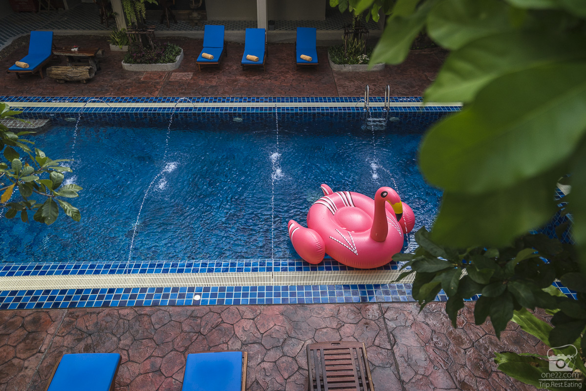 ผ่านตรงโซนต้อนรับมาได้จะเจอสระว่ายน้ำซึ่งขนาดกำลังว่ายสนุกเลยเดี๋ยวมาๆไปดูห้องกันก่อน