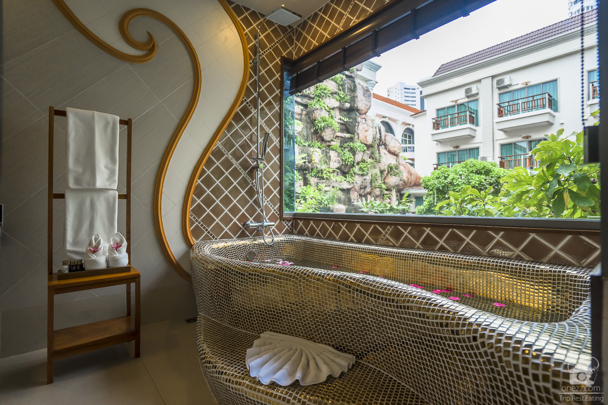 ตัวห้องจะมีความน่าสนใจอยู่คือ ตรงอ่างอาบน้ำที่ตกแต่งเสมือนประดับอัญมณีกันเลย มองดูสวยงามและมีหน้าต่างขนาดใหญ่เห็นวิวของด้านล่างสระน้ำได้