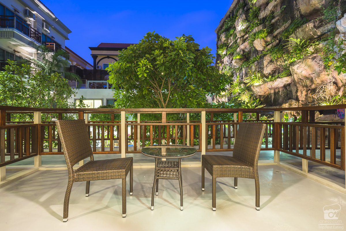 ตรงระเบียงของห้องเราจะมีส่วนของนั่งเล่นอยู่ด้วย ยามเย็นบรรยากาศดีเชียวละครับ
