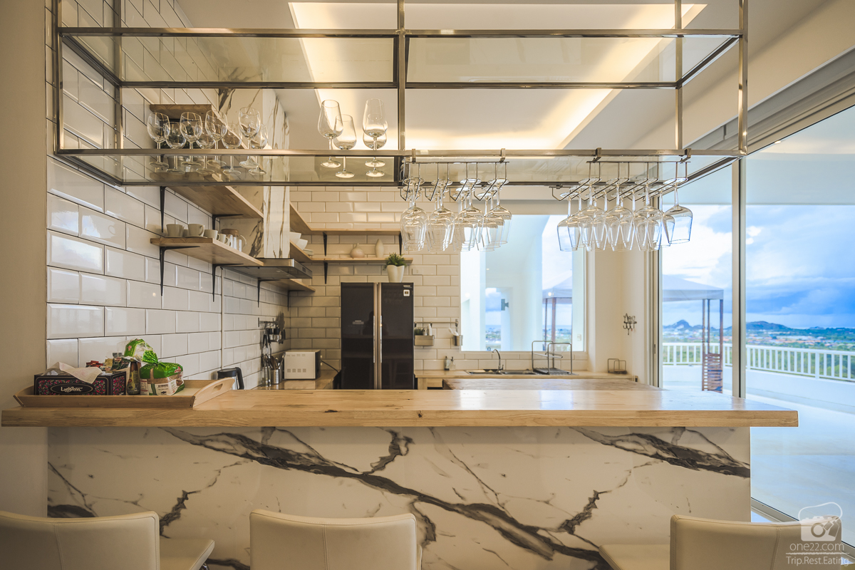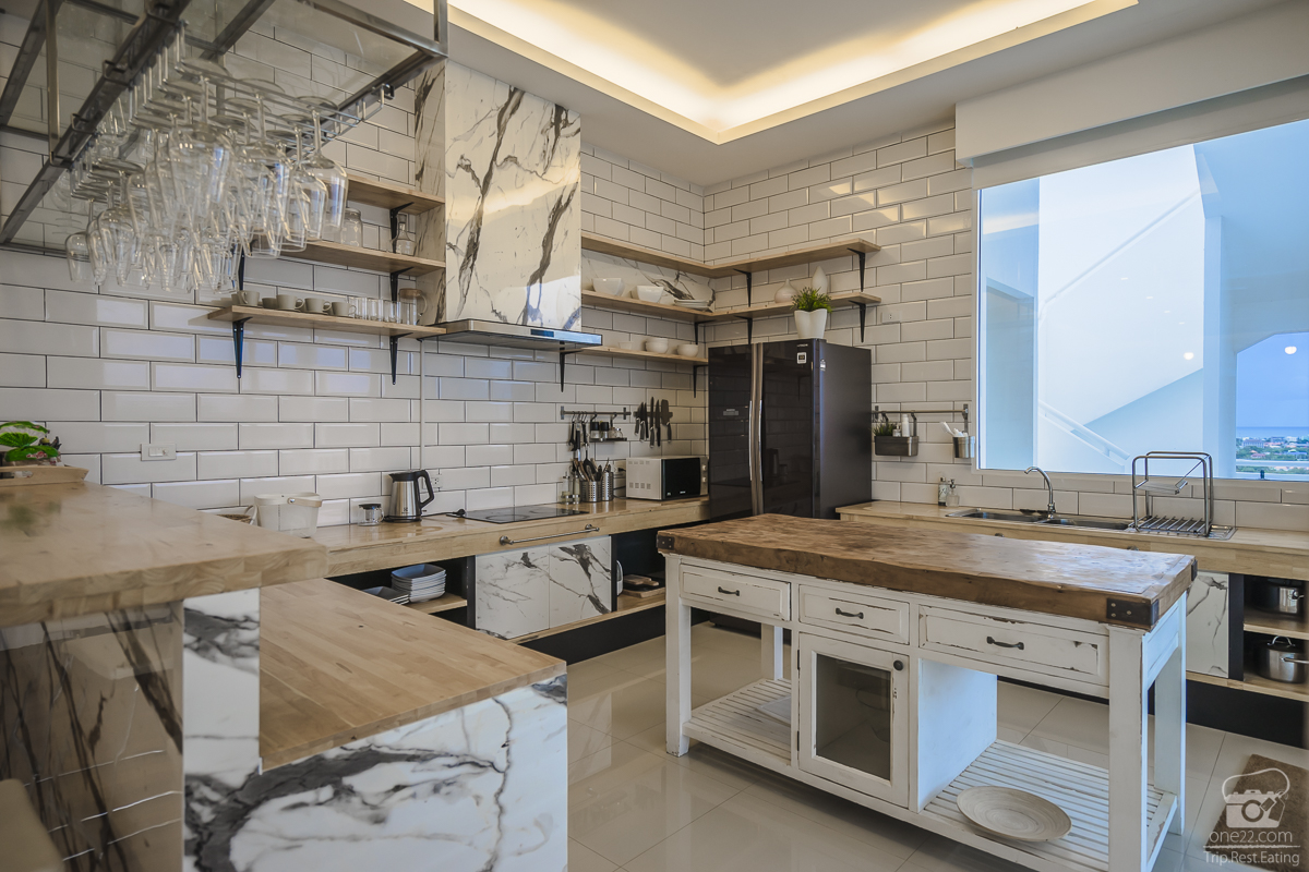 และมุมในสุดจะเป็นห้องครัวแบบฝรั่งที่จะมีโต๊ะวางตรงกลางโซนเพื่อทำอาหารหรือวางข้าวของกินใช้ได้หมด นี่ยังไม่นับอุปกรณ์ทำครัว จานชามที่ครบครัน