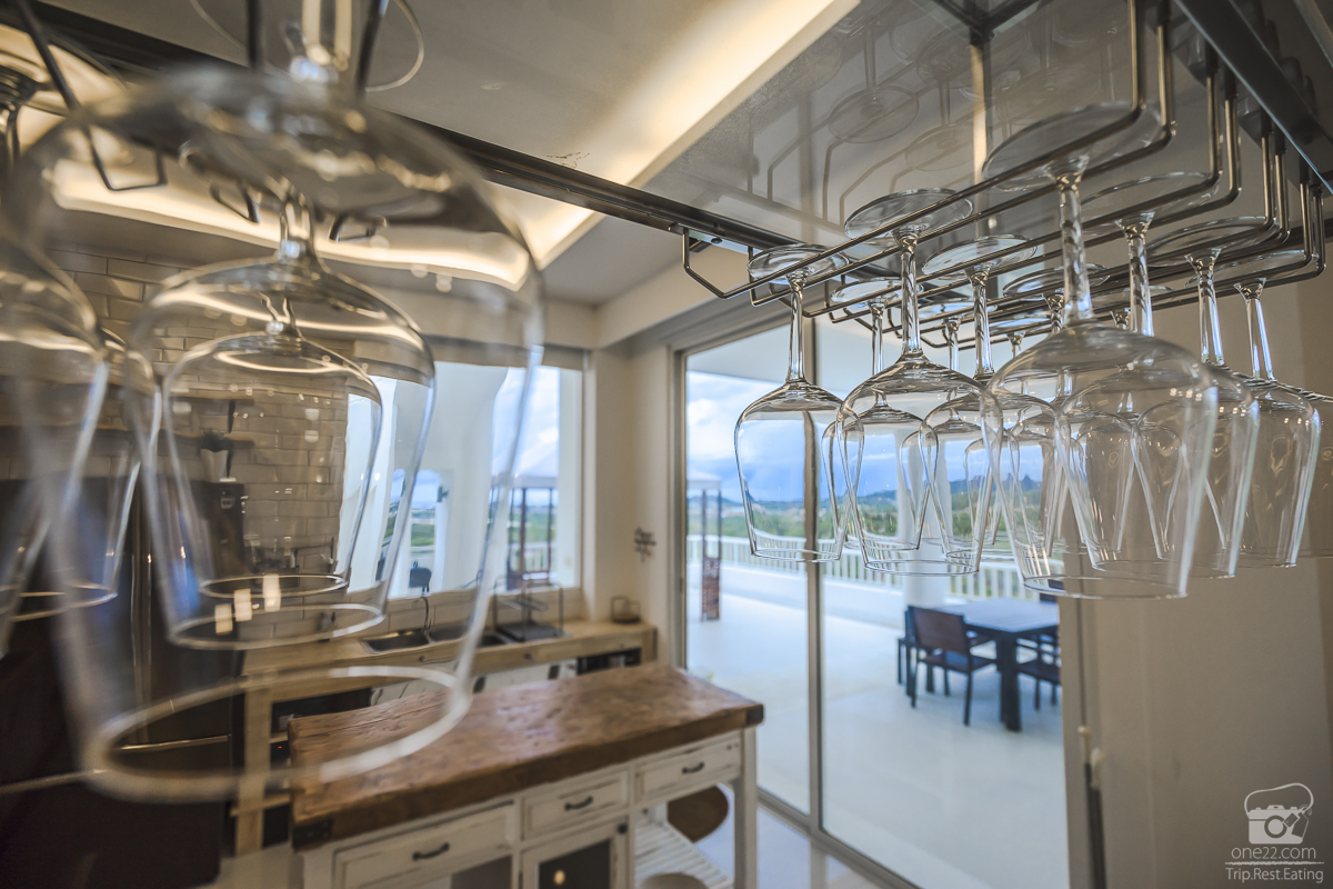 แก้วไวน์แขวนเรียงกันสวยงามรอให้ใช้