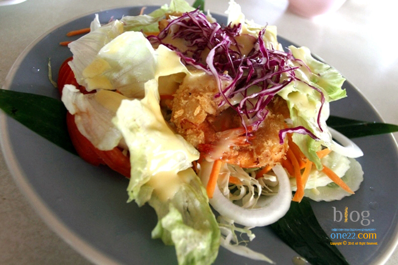 เมนูแรกขอเรียกน้ำย่อยด้วย “สลัดกุ้งทอด” ก่อนดีกว่า เพราะจานนี้ที่เด็ดอยู่ที่กุ้งทอดกรอบอร่อยไม่หืนน้ำมัน และผักสลัดอีกเพียบ ทั้งมะเขือเทศ แครอท ผักกาดแก้ว แตงกวา กะหล่ำม่วง หอมใหญ่ จุใจคนชอบผักแน่ๆ ส่วนน้ำสลัดก็รสกำลังดีไม่เลี่ยน