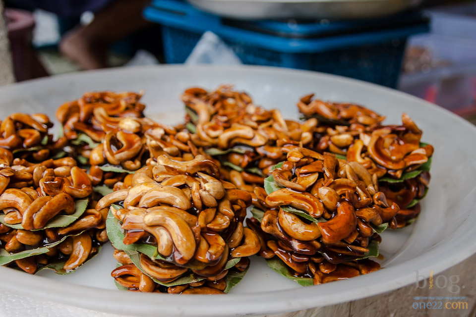 เป็นขนมทำจากเม็ดมะม่วงหิมพานต์ ราดด้วยน้ำตาลเคี่ยวเหนียวๆรองด้วยใบมะม่วงเอง