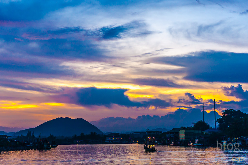 ภาพเรือหาปลายามเย็นได้เวลากลับฝั่ง เห็นเขาพลายดำตั้งเด่นอยู่ไกลๆ สวยดีทีเดียว
