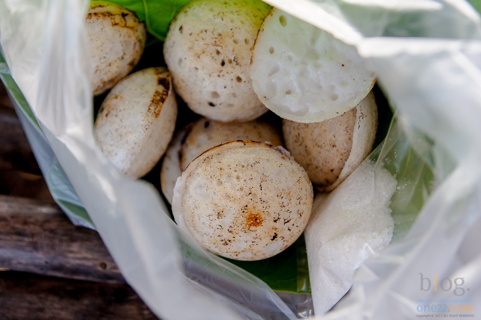 ขนมครกของคุณยายก็แปลกดีนะครับคือจะไม่เหมือนที่ผมเคยกินมา จะไม่ผสมน้ำตาลเข้าไปในเนื้อแป้งตั้งแต่แรก เพราะฉะนั้นรสชาติจะมันๆกรอบๆ แต่ไม่เลี่ยนนะครับ และอยากได้ความหวานก็เพิ่มได้โดยจิ้มกับน้ำตาลที่ใส่ถุงมาให้ แปลกดีครับรสชาติอร่อยดีด้วย ถือเป็นขนมครกโบราณได้ไหมครับแบบนี้ เก๋ซะ 🙂