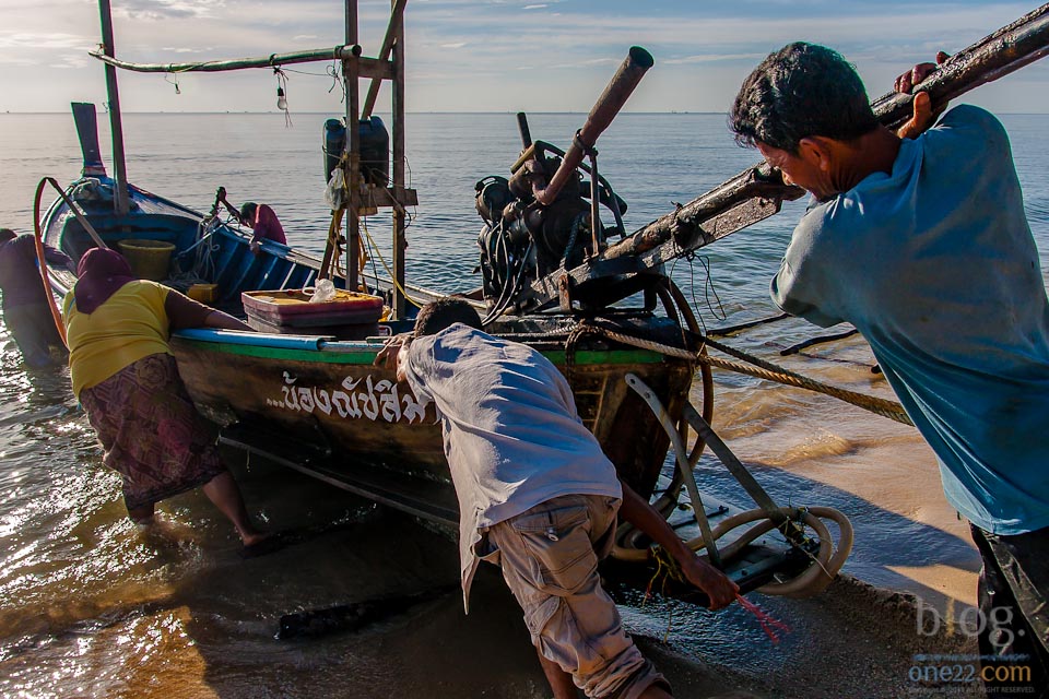 วิธีการนำเรือขึ้นฝั่งของขาวบ้านก็เป็นไปในแบบง่ายๆ มีรอกที่ดังกระหิ่มเป็นตัวชักลากเรือ หรือที่ชาวบ้านเรียกให้ผมฟังว่า “ลูกหมา” ใช่ครับ ผมได้ยินแบบนี้จริงๆนะเออ 55