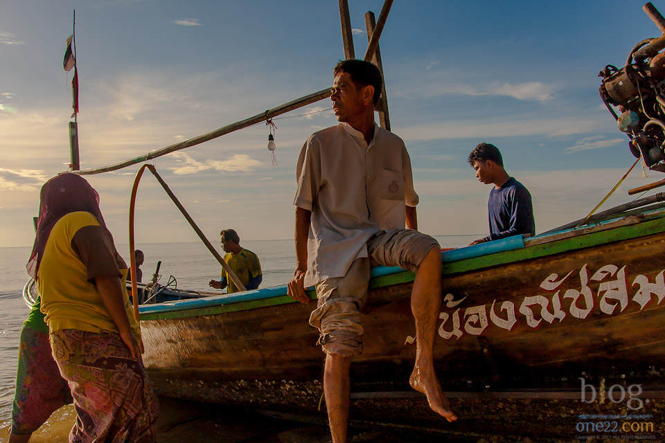 ผมรอไม่นานเรือประมงลำกลางๆก็ทยอยแล่นเข้ามาเทียบฝั่ง ชาวเรือด้วยกันโดยเฉพาะสาวน้อยใหญ่ชาวมุสลิม ต่างก็กุลีกุจอ ลงไปช่วยกันนำเรือเข้าฝั่งกันทุกลำ