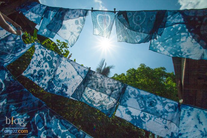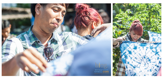 นอกจากนี้พวกเรายังได้ร่วมกันทำกิจกรรมย้อมสีผ้าหม้อฮ้อม เริ่มตั้งแต่การนำผ้าขาวมามัด ซึ่งการมัดก็มีหลายวิธีที่แตกต่างกันไป แต่ละวิธีก็จะให้ลวดลายออกมาแตกต่างกัน ซึ่งแต่ละแบบก็มีความสวยงามแตกต่างกันไปหลากหลายรูปแบบตามสไตล์ของแต่ละคน จากนั้นก็จะนำผ้าที่มัดแล้วไปย้อมสี ไม่นานเราก็จะได้ผ้าหม้อฮ้อมที่สวยงามจากการทำขึ้นมาด้วยตัวเองเป็นผ้าที่มีลวดลายเดียวในโลก และแน่นอนเราสามารถนำผ้าหม้อฮ้อมที่ตัวเองย้อมนำกลับไปเป็นของที่ระลึกได้อีกด้วย
