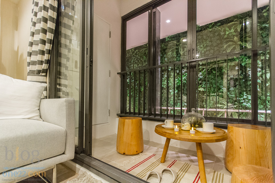 ขนาดระเบียงเล็กมากจนไม่น่าจะวางอะไรได้ นอกจากของตกแต่งพวกต้นไม้หรือ โต๊ะญี่ปุ่นตัวเล็ก แต่จากห้องตัวอย่างที่เห็นเค้ายก คอมแอร์ไว้ติดผนังด้านบนประหยัดพื้นที่ด้านล่างไปได้ มองมาจากด้านนอกไม่เห็นเพราะมีระแนงปิดบังตาไว้ ผมว่าถ้าชั้นบนๆก็ไม่เห็นอยู่แล้วละจริงไหมครับใครจะขึ้นไปมองได้ละเนอะ 555 สรุปว่า Work ดีครับ