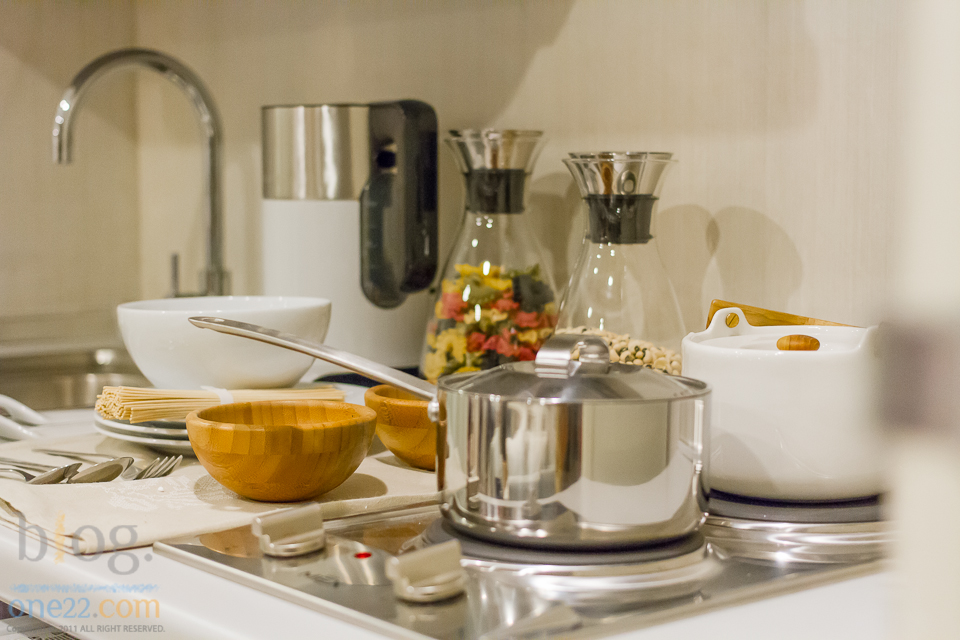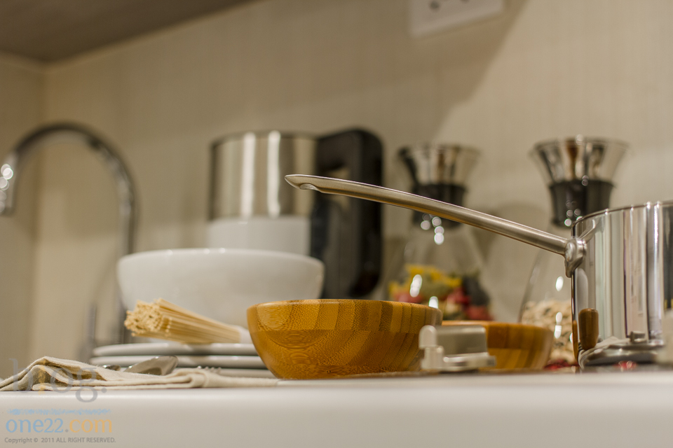 ส่วน ครัวอยู่ในแนวเดียวด้านหลังชุดรับแขกให้พื้นที่ใหญ่สุดของทุกๆ Type วัสดุดีใช้ได้แบบเดียวกันกับห้อง One Bed ทั้ง ชุด แต่ต่อขยายตู้และชั้นวางขนาดใหญ่ได้มากขึ้น